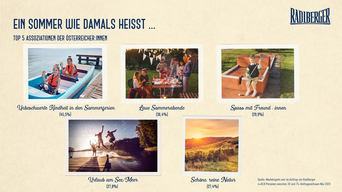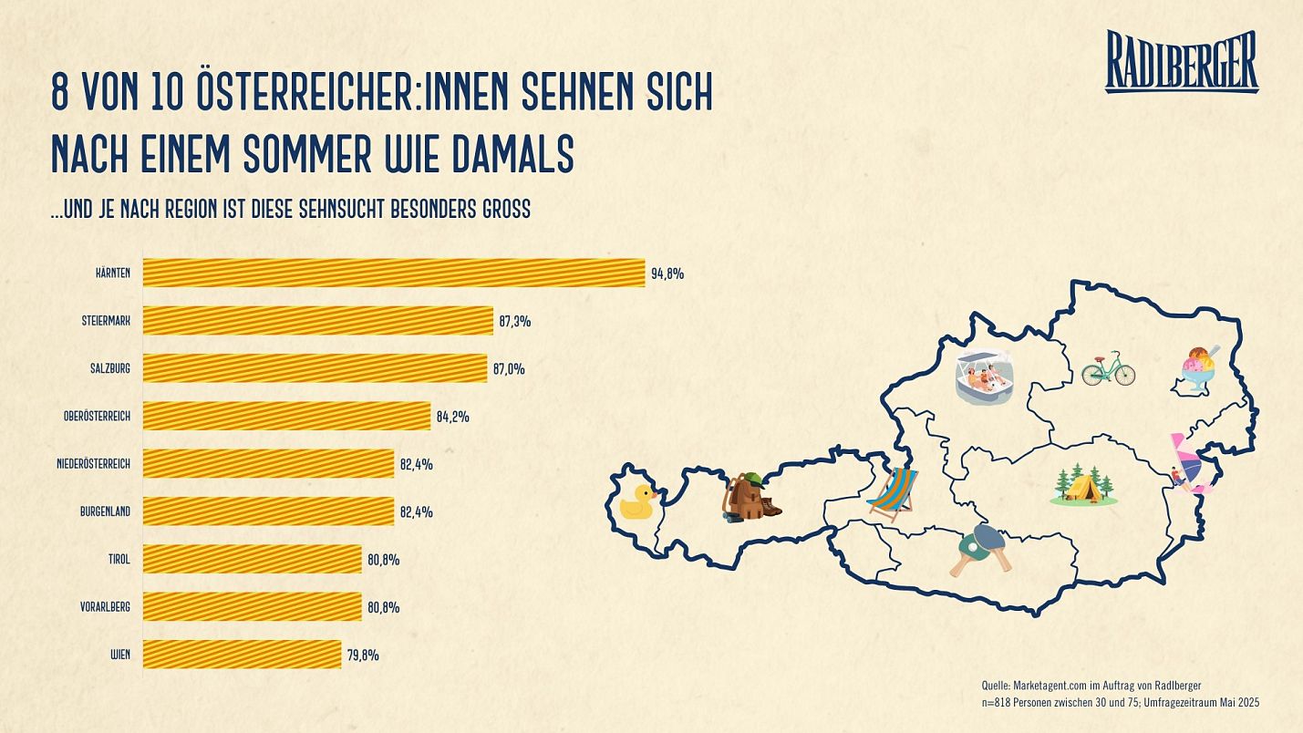 Das Online Marktforschungsunternehmen marketagent.com führte im Auftrag von Radlberger im Mai 2025 eine repräsentative Umfrage unter 818 Österreicher: innen im Alter von 30 bis 75 Jahren durch. Ziel war es, herauszufinden, welche Assoziationen Menschen mit dem Gefühl „Ein Sommer wie damals“ verbinden, um warum Retro-Produkte wie Radlberger gerade jetzt so gut ankommen.